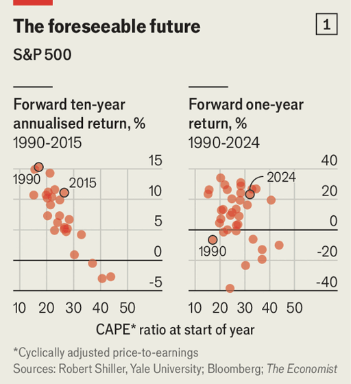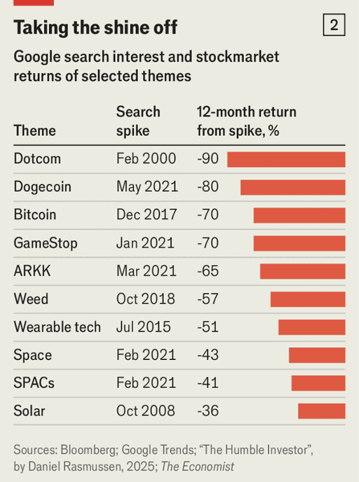 今天,以人工智能为重点的市场呈现出类似拉伸的指标:按过去十年实际盈利计价,标普500指数的估值仅在1999—2000年更高过一次,而按销售额计,它比当年繁荣顶点时还要贵逾60%。像高席勒CAPE市盈率这样的估值指标可以解释长期十年平均回报偏低,却对一年期走势几乎没有相关性,相比之下,比特币、狗狗币、大麻、SPAC、GameStop和ARKK等投机热点在谷歌搜索激增时往往正好见顶,此后12个月价格普遍大幅下跌。
