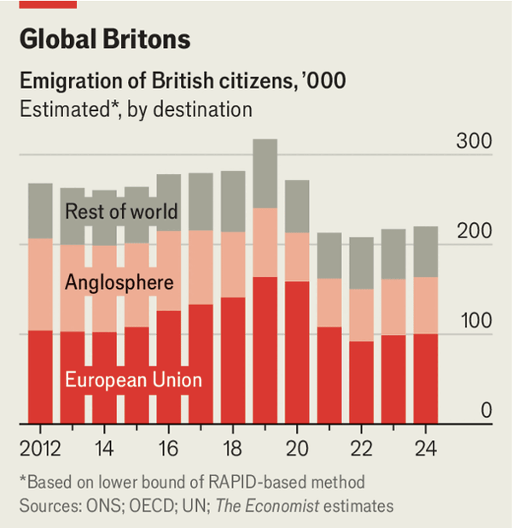 利用经合组织和联合国公布的目的地国数据所做的独立分析却显示,英国公民的移民规模大概率在下降,脱欧前几年平均约为27.5万,如今约为22万。前往欧盟的移民占全部离英人数近一半,在2016年公投与2021年自由流动结束之间,从大约10万上升到16万,因为人们抓住最后机会搬到欧洲大陆,之后又回落,而盎格鲁国家每年吸纳约6万英国人、世界其他地区约5.5万,合计不到英国人口的0.5%,而且多为临时性迁徙。