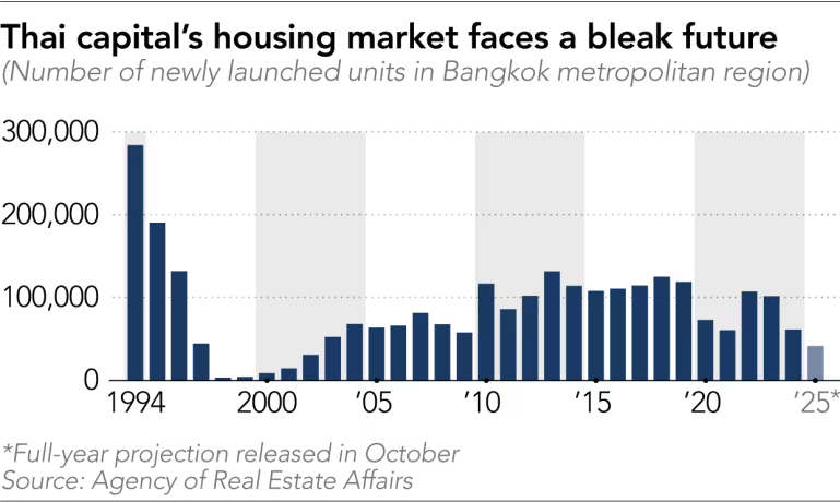 Supply-demand metrics show a market trying to brake into an oversupply. AREA estimates around 220,000 unsold units in Bangkok and another ~200,000 nationwide, roughly 400,000 units held by developers. CBRE reports only 13,700 condo units launched in Bangkok in the first three quarters of 2025 versus an annual average of about 52,000 from 2014–2024. CBRE forecasts fewer than 40,000 new units in 2026, about 20,000 in 2027, and just over 10,000 total across the following two years.