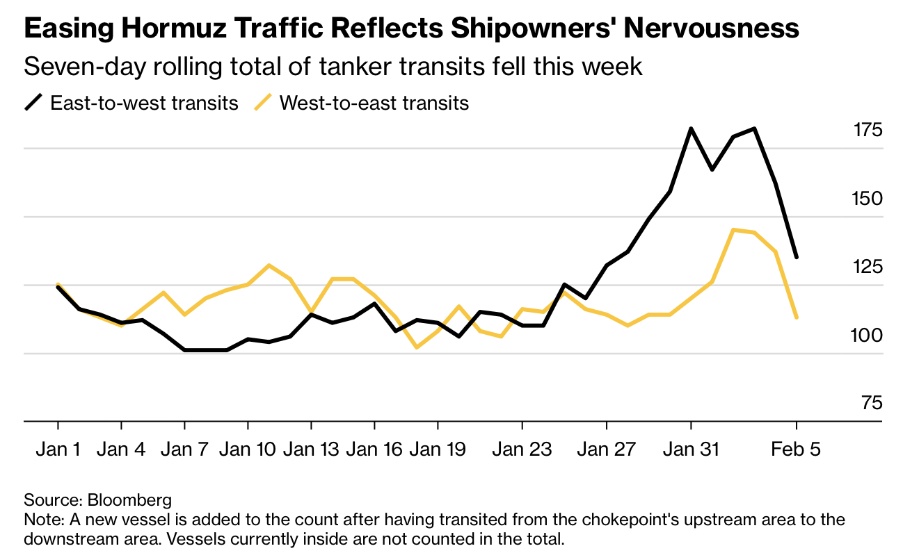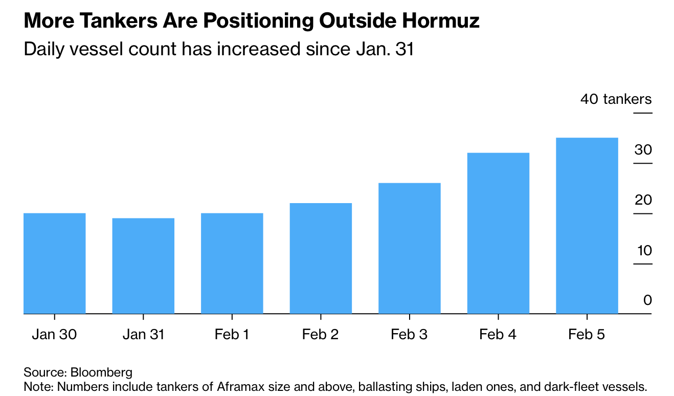 Overall traffic has edged lower. On a seven-day rolling basis, the number of crude and product carriers entering the strait fell to 135 from 182 on Jan. 31, while exits declined from 120 to 113. The pool of Aframax-sized vessels and larger loitering outside the strait has risen steadily since Iran announced drills. Although delays allow owners to renegotiate war-risk insurance premiums, those costs have not yet increased materially.
