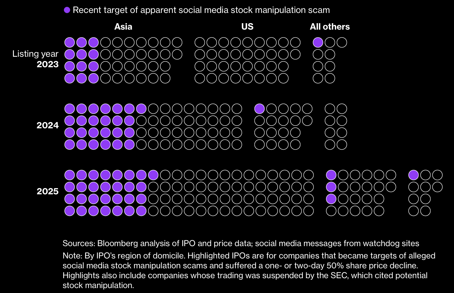Since 2023, Bloomberg analysis shows a sharp rise in suspected pump-and-dump activity in U.S. markets. On Nasdaq’s smallest listing tier, about 25% of more than 250 IPOs were promoted in WhatsApp chats and then fell 50% within one or two days or were suspended by the SEC. Five small-tier NYSE listings showed similar patterns. Roughly 60 new listings have erased about $16 billion in market value since 2023 through one- or two-day crashes.