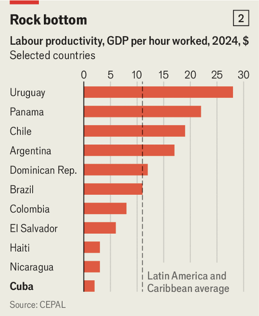 Public transport has all but vanished, petrol is scarce or dollars-only, and 40 litres cost $46—multiple times the average monthly salary. About a quarter of the population has emigrated in the past five years, with 788,000 leaving in 2023 alone. The professional class is fleeing: the number of family doctors halved, as did the national ballet corps. In regional labour productivity, Cuba now ranks last of 28 countries, sugar output has plunged to 150,000 tonnes (the lowest in a century), and tourism has not recovered post-pandemic, leaving hotels largely empty.