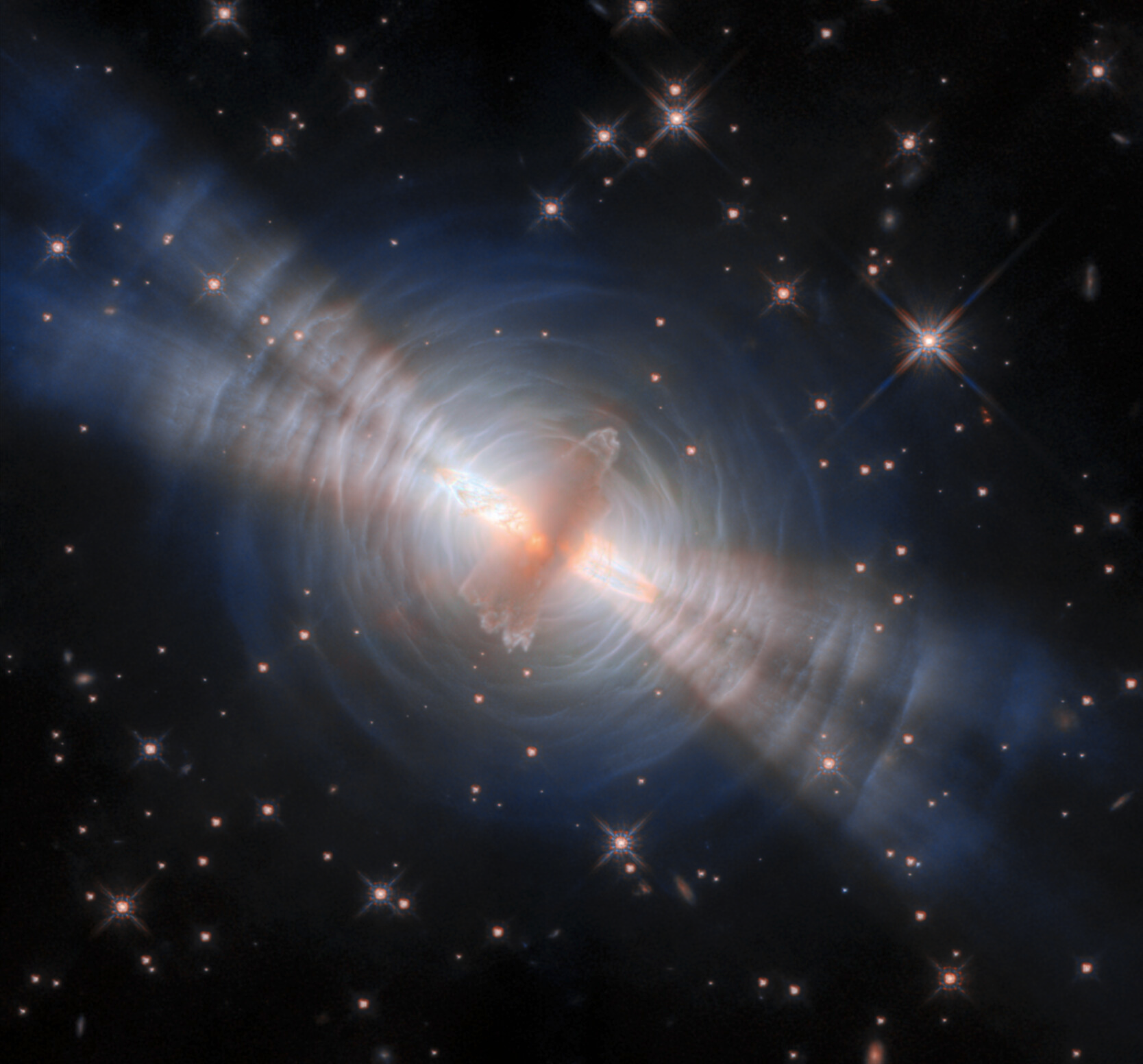 The image shows twin fast polar beams cutting through older, slower concentric dust arcs, a kinematic contrast that supports multi-episode ejection rather than a single explosive event. The dusty disc feeding this geometry was expelled only a few hundred years ago, and the overall pre-planetary interval lasts just a few thousand years, so the system preserves unusually fresh dynamical evidence. Morphological regularity in the arcs and lobes suggests gravitational shaping by at least 1 hidden companion star, with Hubble’s resolution enabling direct epoch-to-epoch structural comparisons.