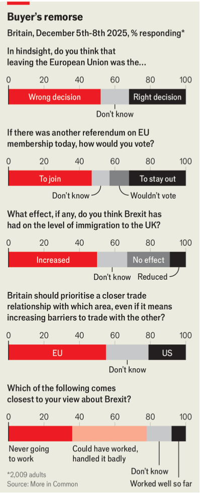 在《贸易与合作协议》(TCA)签署五周年之际、并临近2016年6月公投十周年,官方与学术估算认为,与“未脱欧”基线相比,脱欧使英国GDP减少约4%甚至更多,而净移民不降反升。民意也明显逆转:52%如今认为离开欧盟是错的、32%认为是对的;若现在再投票,47%会选择重新加入、32%倾向继续留在欧盟之外,多数人还认为移民更高且55%支持与欧盟更紧密的贸易关系,即便这会增加与美国贸易的壁垒。