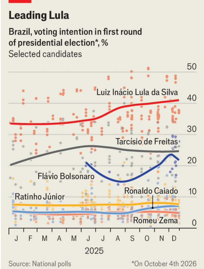 In early 2025, 80-year-old Luiz Inácio Lula da Silva’s approval was crumbling amid corruption vulnerability and recent brain surgery, while markets fretted about spending and in 2024 the real was the world’s worst-performing major currency. Since January 2025, his appointee running the central bank has kept rates high as the government squeezed disability and Bolsa Família outlays, expanded power and mortgage subsidies, and passed reforms in November that mean 16m Brazilians pay less or no income tax; a weaker dollar since January 2025 has strengthened the real and cut food inflation, lifting Lula into frontrunner status for October.