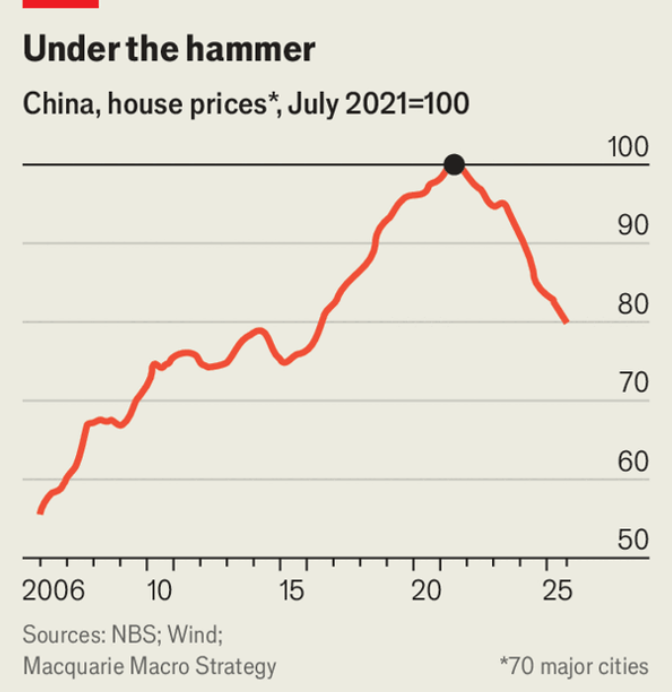 Fresh residential construction is down nearly 75% and property investment is down over one-third, but price declines are the key risk because banks, insurers, and state asset managers hold real-estate-linked collateral. One estimate says 85% of the decade-to-2021 price gains have been erased, versus 47% of the 1996–2006 increase wiped out in America’s 2007 crash.