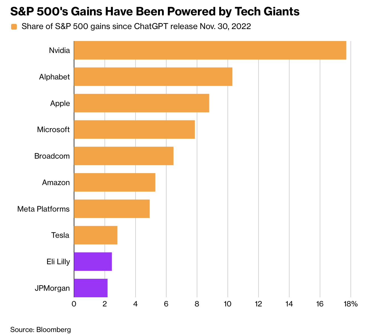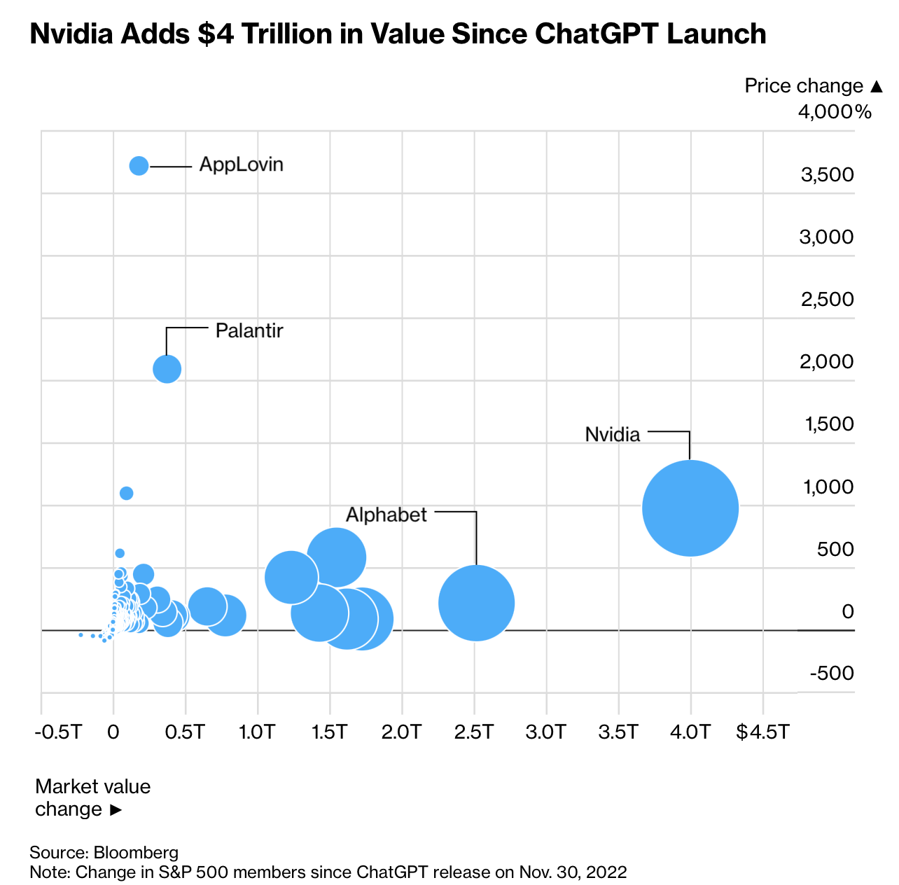 Over three years, the structure of the US equity market has been reshaped by capital concentration driven by generative AI. Since the launch of ChatGPT in November 2022, AI-driven gains have lifted the S&P 500 by about 64% and expanded the weight of the top seven technology firms from roughly 20% to about 35%. These firms (Nvidia, Microsoft, Apple, Alphabet, Amazon, Meta, Broadcom) contributed nearly half of index performance. Conversely, sectors exposed to AI displacement—software, staffing, advertising—fell sharply, with a UBS basket down more than one-third, while individual stocks such as LivePerson and Chegg dropped about 97%, and ManpowerGroup and Robert Half declined more than 65%.