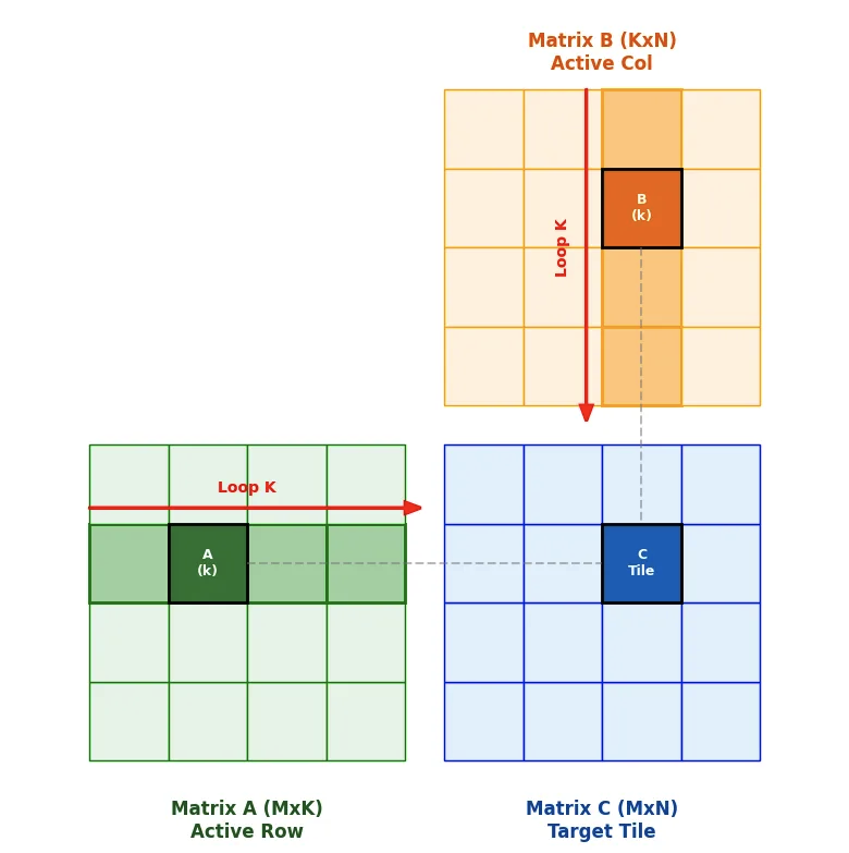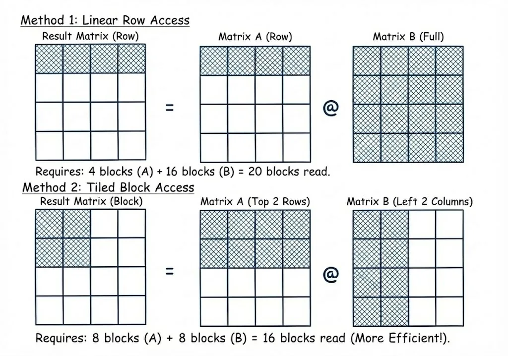 This article explains how to implement high-performance matrix multiplication using NVIDIA’s cuTile framework on Blackwell-architecture GPUs. The environment requires CUDA 13.1 or higher, NVIDIA Blackwell GPUs (compute capabilities 10.x and 12.x), and Python 3.10 or later. Matrix multiplication is defined as multiplying A(M×K) by B(K×N) to produce C(M×N), with computation summing over the K dimension. cuTile uses block-level Tile programming, dividing the output into (tm×tn) tiles, assigning one Block per tile, and iterating over K while loading (tm×tk) and (tk×tn) subtiles.