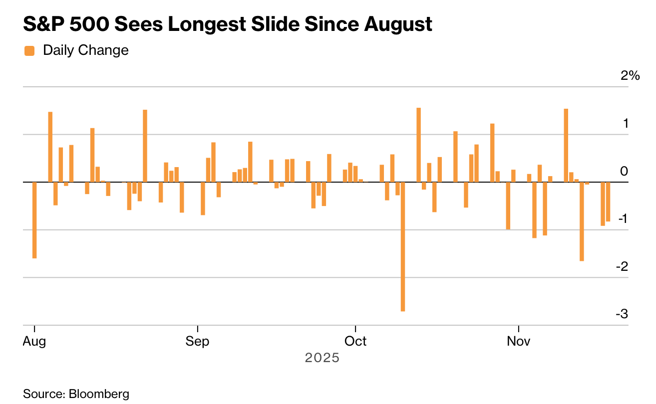 A selloff in mega-cap tech dragged the S&P 500 down nearly 1% for a fourth straight session — its longest skid since August. A tech megacap gauge fell 1.8%, and the VIX hovered near 25. Nvidia slid 2.8% ahead of earnings; its standalone market value now exceeds the combined energy, materials, and real-estate sectors, and on some days even surpasses their total including utilities. Concerns are rising that AI capex is outpacing revenue gains. A Bank of America survey showed cash levels falling below a key threshold, triggering an equity “sell signal,” with stock exposure at its highest since February. Bitcoin rebounded after dipping below $90,000, and 10-year Treasury yields eased to 4.12%.