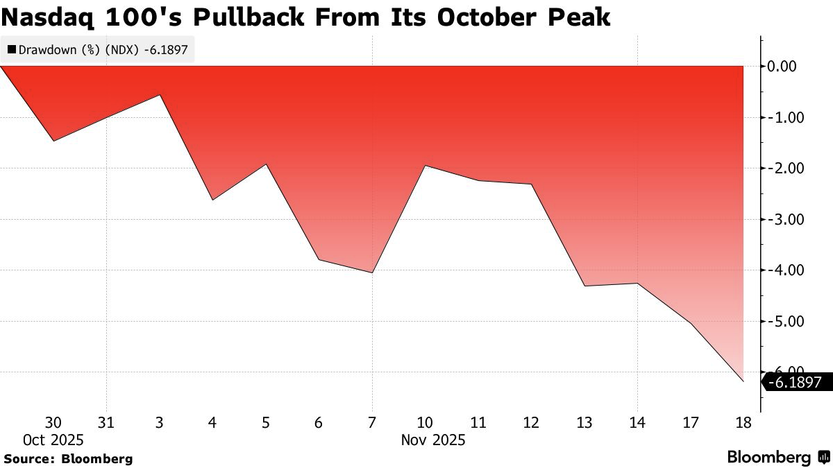Macro signals are amplifying unease. Rate-cut expectations for December are fading as Fed officials warn inflation progress may stall. Credit spreads across IG and junk hover near multiweek highs. Initial jobless claims held at 232,000, and ADP data show firms shed an average of 2,500 jobs per week in the four weeks to Nov. 1, indicating labor softening. With official October jobs data delayed by the shutdown, markets await Thursday’s September report; weaker results could revive hopes for a December cut and fuel a year-end rally.