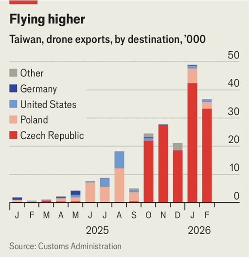Taiwan is rapidly developing a drone industry free of Chinese components. Production rose from about 10,000 units in 2024 to more than twelve times that level in 2025, while exports increased more than thirty-fivefold to roughly 123,000 units, nearly matching total output. Major buyers included the Czech Republic and Poland, with many drones ultimately deployed on Ukraine’s battlefield. In the first two months of 2026 exports already reached 85,500 units, suggesting another strong year. Some models are kamikaze quadcopters capable of carrying bombs of up to 8kg and flying at 140kph. Although they cost about twice as much as comparable Chinese drones, their main advantage is the absence of Chinese components.