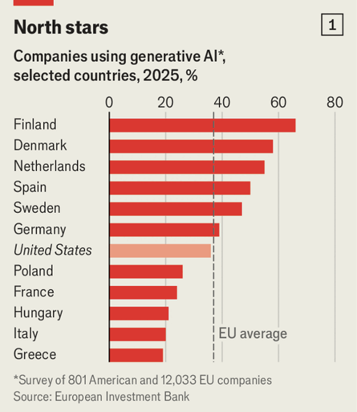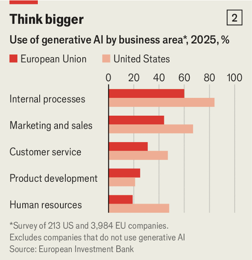 Adoption is accelerating among individuals and firms. Microsoft finds 32% of Europeans use generative AI, above America’s 28% and China’s 16%. A European Investment Bank survey shows 37% of EU companies use generative AI, similar to America’s 36%, but with wide variation: Finland at 66% and Denmark at 58%, versus Italy at 20% and Greece at 19%. Usage breadth lags: only 55% of EU AI users deploy it in at least two business areas, compared with 81% in the United States.