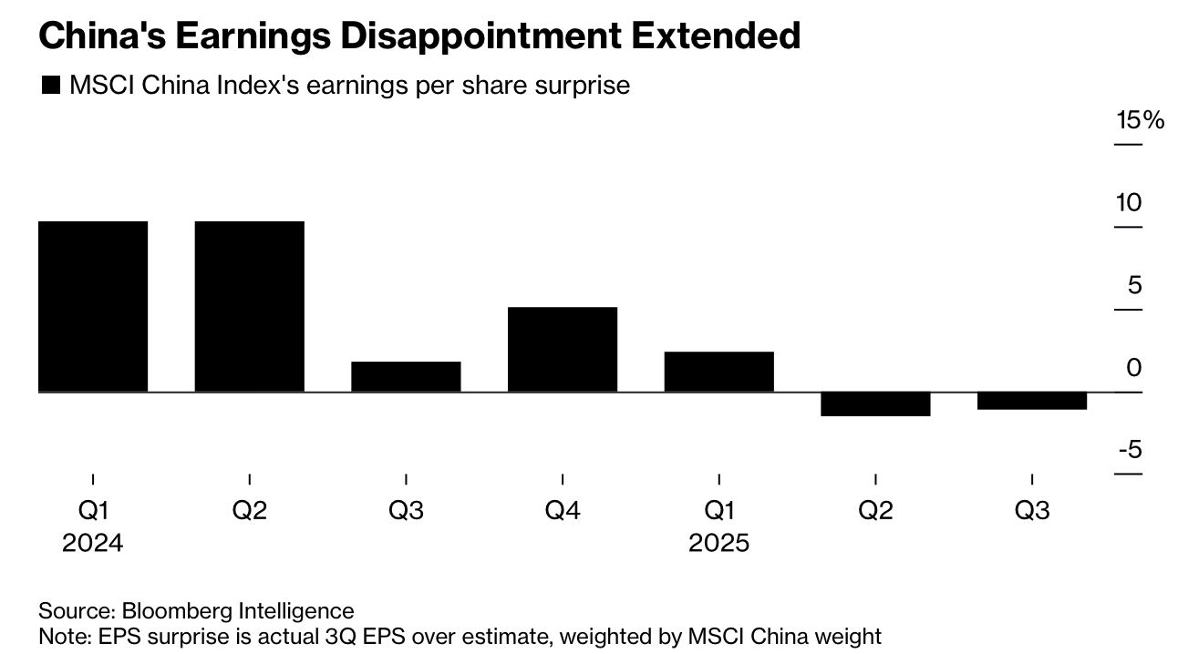 MSCI China Index members recorded a 1.1% negative earnings surprise in the third quarter, extending prior weakness, based on companies representing 97% of index market capitalization. Real estate and consumer-sector disappointments offset materials and financials. Industrial profits resumed decline after a brief rebound, reinforcing deflation pressures. EV makers Li Auto, Nio, and Xpeng missed revenue and delivery forecasts due to price wars and reduced subsidies; Xiaomi’s EV unit and Geely posted strong growth but face margin risks as tax incentives shrink. Materials firms benefited from surging gold prices, with Zijin Mining posting a 57% net-income jump and Jiangxi Copper up 35%. Solar firms showed slight improvement, with Longi narrowing losses.