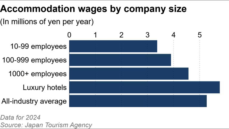 Labor conditions and costs are a major constraint. Average annual pay in accommodations at firms with 10 or more employees was 3.9 million yen in 2024, more than 20% below the all-industry average of 5.27 million yen. By firm size, pay averaged 3.37 million yen at companies with 10–99 workers, 3.9 million yen at those with 100–999, and 4.57 million yen at firms with 1,000 or more. The post-pandemic surge in visitors has worsened labor shortages, pushing the vacancy rate in accommodations and food service to 4.4% by end-June 2024, compared with 2.9% across all industries. While some operators raised wages—Fujita Kanko lifted pay by an average 6.3% for about 1,300 workers—others cut labor costs through automation and outsourcing.
