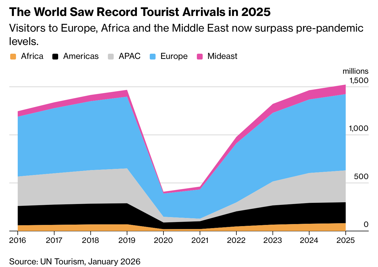 Global tourism reached a record in 2025 with 1.52 billion international arrivals, nearly 4% above the 2019 pre-pandemic peak, and more than half of visitors went to Europe. Concentrated demand has intensified pressure on cities such as Paris, Rome and Barcelona, prompting local measures to redistribute costs, including charging tourists up to 50% more in some Paris cafés. Experts argue such pricing is less a rip-off than a potential tool to manage overtourism.