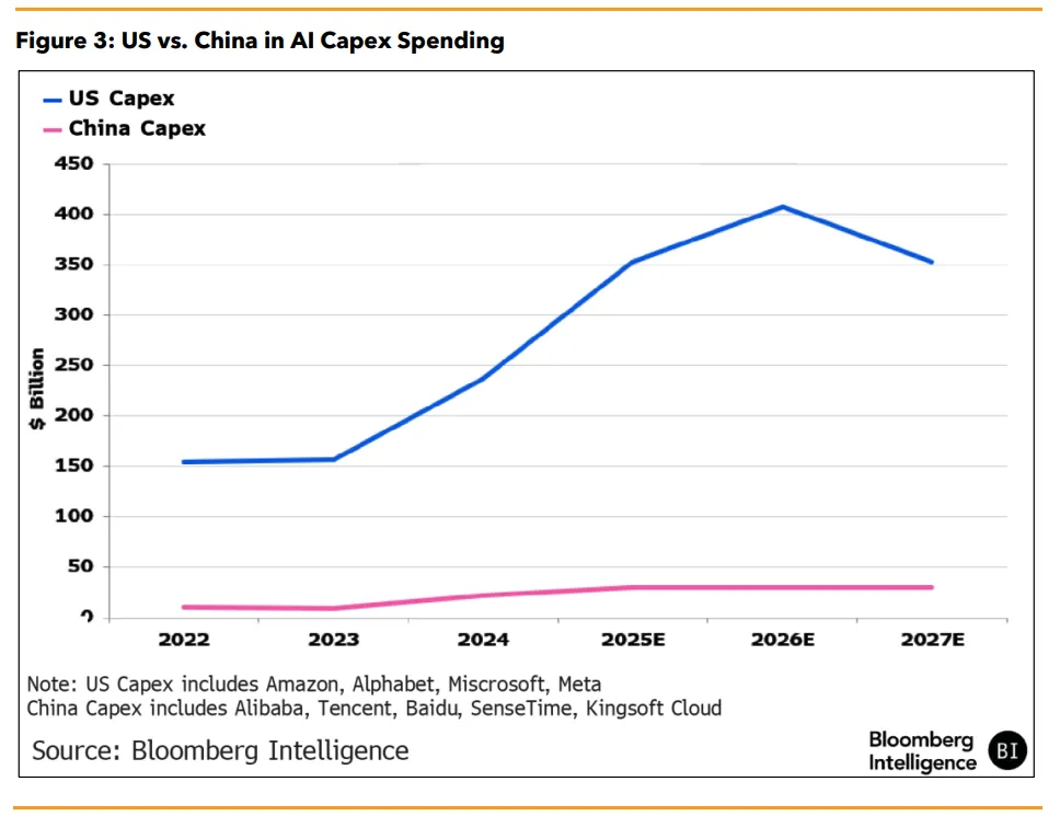 China ranks second globally in generative AI but operates under a “high-investment, low-return” model. Bloomberg Intelligence estimates China’s AI capex for 2026 at about $32 billion—less than one-tenth of the >$100 billion each signaled by Alphabet, Meta, and Amazon. DeepSeek’s September output-token API cut to $0.42 represents a 96% discount to GPT-4o/5 and 97% below Claude Sonnet 4, underscoring intense price competition and thin margins. Free open-source models and ultra-low API pricing, combined with Alibaba, Baidu, and Tencent effectively subsidizing national AI ambitions, suppress commercial profitability.