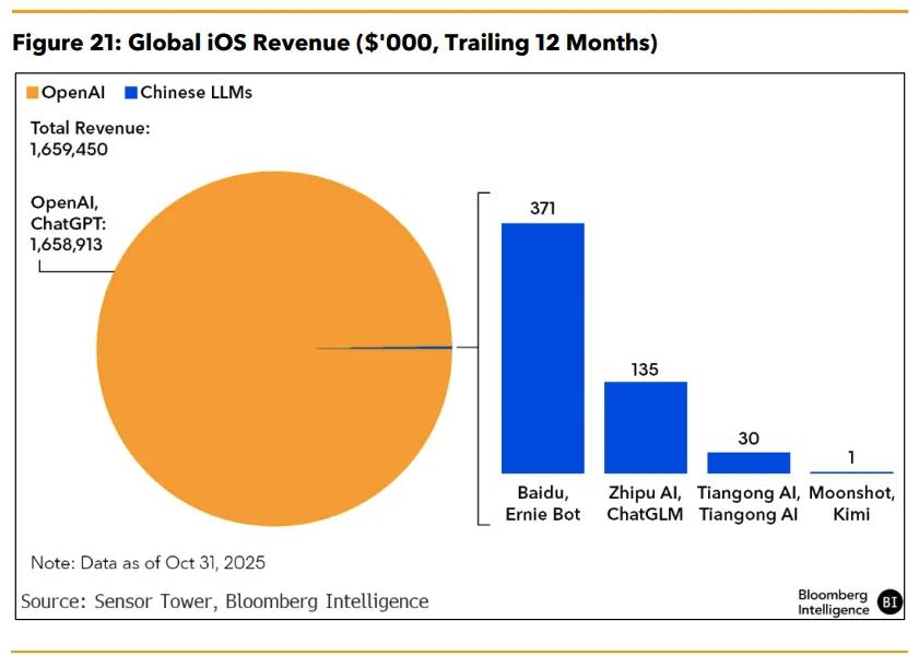 中国在生成式 AI 竞赛中位居全球第二,但产业结构呈现“高投入、低回报”特征。Bloomberg Intelligence 指出,中国 AI 资本支出预计在 2026 年约为 320 亿美元,不足美国三大云厂商动辄每家逾 1,000 亿美元的十分之一;DeepSeek 9 月将输出 token API 价砍至 0.42 美元,较 GPT-4o/5 低 96%、较 Claude Sonnet 4 低 97%,反映极端价格战压缩行业利润。国内厂商普遍依赖免费开源模型与极低 API 定价,加上阿里、百度、腾讯等主动补贴国家 AI 战略,使商业化能力长期受限。